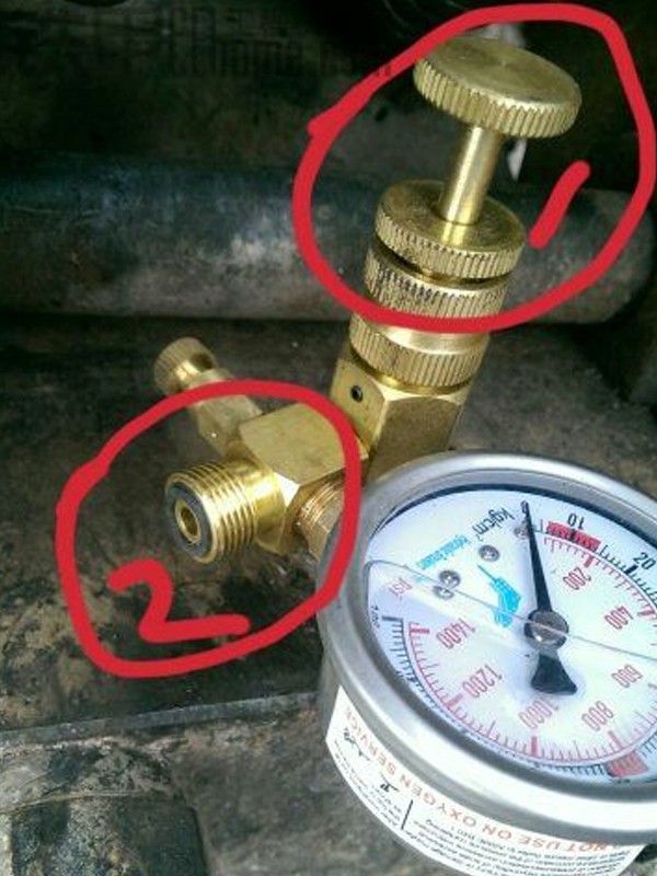 第三步,裝氮氣表,測氮氣壓力。將氮氣表按說明擰在加注口螺絲上,然后就開始測氮氣了,但在測氮氣之前要保證圈圈2那顆螺絲是裝上去的,要是沒有裝上去你一測氮氣就會全部放光。